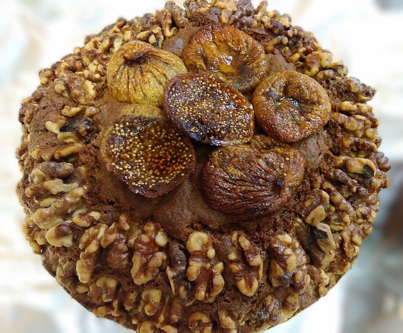 薄力粉・砂糖・バター・卵・レーズン・オレンジピール・いちじく・クルミ・・バニラオイル・シナモン・ラム酒・ブランデー・ベーキングパウダー・カラメルソース
